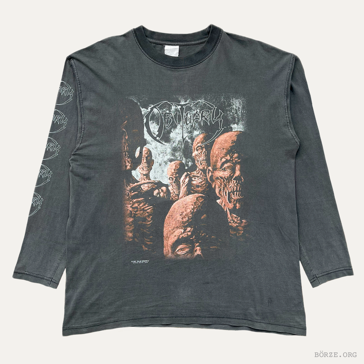 Description: 1997 Obituary Back From The Dead XL long sleeve, licensed by Blue Grape Merchandising, super nicely faded and gently distressed condition - cracking print on front, back and logo hit running down right sleeve (rare). Few pin holes on front, and nicely distressed armpit, with some seam stitching uncoming.