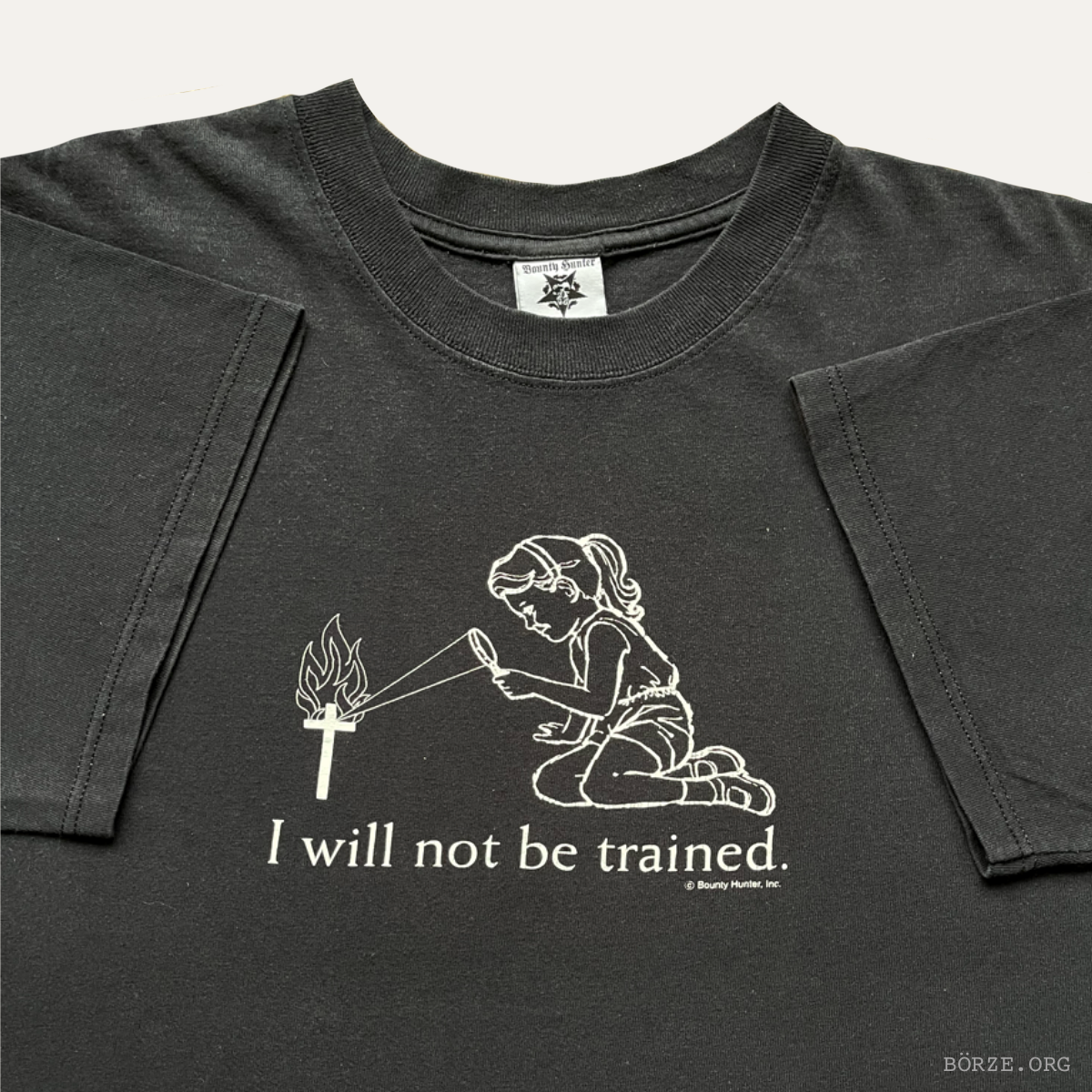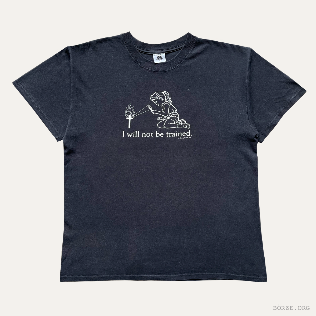 Condition: Very rare early 2000s Bounty Hunter I Will Not Be Trained T-shirt with illustration of a girl burning a cross with a magnifying glass. Slightly faded, lower back thread opening, overall great condition.